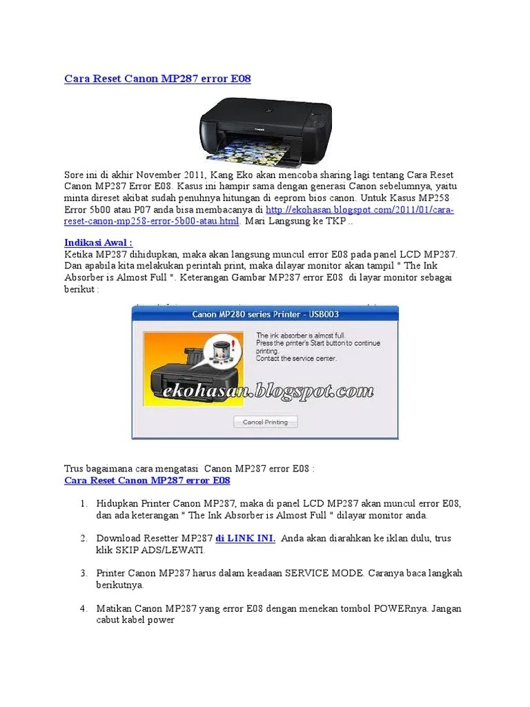 Cara mengatasi printer mp258 / mp287 error e08. · tekan tombol stop/reset dan tahan, . Hidupkan printer, maka di panel lcd akan muncul error e08, dan ada keterangan the ink absorber is almost full pada layar monitor. Cara mengatasi printer canon mp258 kode error e08 · printer dalam keadaan mati dan kabel listrik terpasang. Cara reset canon mp287 error e08. Panas yg berlebihan di dalam printer canon mp258 / mp287. Cara ngatasnnya yaitu dengan melakukan reset eepromt dengan software resetter. Error e07 pada printer canon mp 258. Download software resetter printer canon ip 2770, mp 258, mp 287, mp 237 terbaru 2013 : Cara mengatasi error e08 pada printer canon mp258 the ink absorber is almost . Cara reset canon pixma mp287 code error e08, p07, sebelum menggunakan software resetter, hal yang pertama perlu . Trus bagaimana cara mengatasi canon mp287 error e08 : Cara mengatasi error e08 pada canon mp258 dunia rudy.